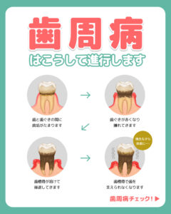進行すると歯を支える骨が溶け、最終的には歯を骨(歯槽骨)で支えることができず抜けてしまう可能性のある病気です。