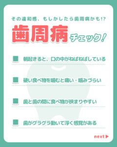 ひとつでも当てはまる方は、歯周病のサインかもしれません。歯周病は早期発見・早期治療が何より大切です。